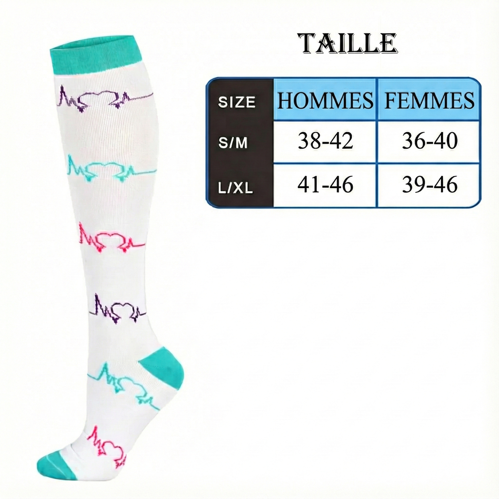 Type : Chaussettes de compression montantes (jusqu’au genou).